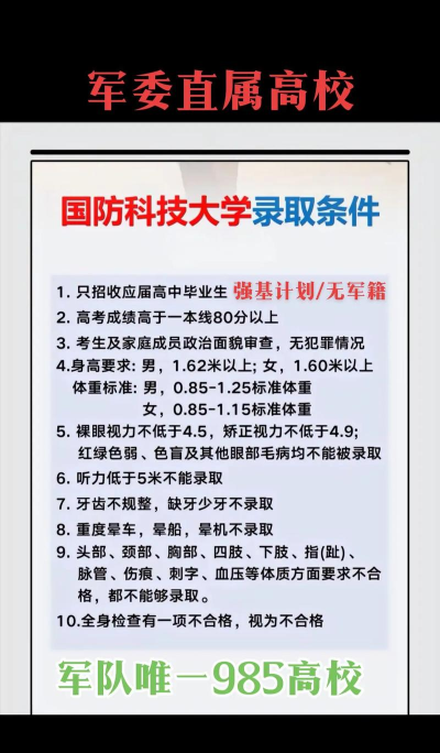 其次,报考国防科技大学是有着非常严格的要求的。不仅要求学生的成绩足够好,还要求身体素质足够好,视力等各方面的综合素质都需要达到招生的标准。军校录取的政审环节需要对学生三代以内的直系亲属进行调查,要求非常严格。