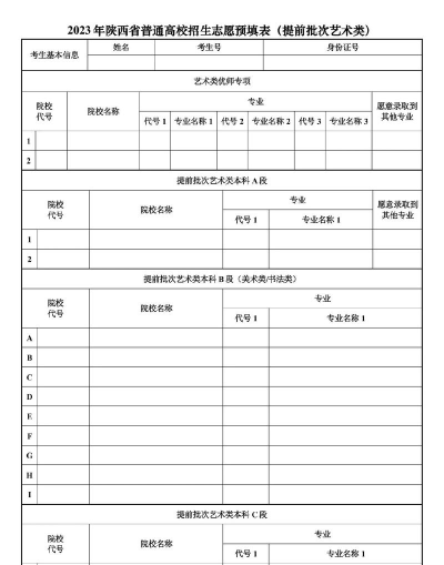 2024年陕西高考艺术类本科志愿在本科提前批次填报,分为优师专项段、本科校考段、本科统考段三段。优师专项段为优师专项中的艺术类专业,实行顺序志愿投档录取模式,设置1个院校志愿,每所院校设3个专业志愿,设“愿意录取到其他专业”的调剂表态栏。