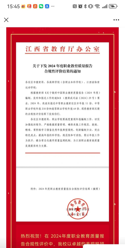 综合考评,成绩斐然。被评为江西省中等职业学校毕业生就业工作先进单位、江西省中等职业学校招生工作先进单位、全省职业教育先进单位、江西省安全文明校园、江西省中小学(幼儿园)平安校园示范学校、江西省中小学师德师风示范学校。2010年,被教育部认定为国家级重点中等职业学校。2011年,被宜春市人民政府评为宜春市名校。2012年,被教育部确定为国家中等职业教育改革发展示范学校建设计划第三批立项建设学校。2014年,被江西省教育厅、人力资源与社会保障厅评为全省教育系统先进集体,被教育部关心下一代工作委员会评为全国青少年五好小公民‘美丽中国·我的中国梦’主题教育活动示范学校。