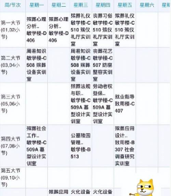 这份课表上,周一到周五都排得满满当当,包括殡葬心理分析、殡葬礼仪、丧葬花艺、丧葬习俗、火化设备与技术、殡葬社会工作、殡葬应用设计、公墓陵园管理等等。