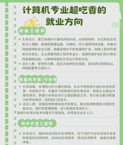 适合于从事计算机网络、嵌入式技术、高性能计算、网络信息安全与多媒体信息处理等领域的工作。毕业生可以到众多软件企业、事业单位的信息技术部门、教育部门等单位从事软件工程领域的技术开发、教学、科研及管理等工作;也可以到大中小型电信服务商、通信设备制造企业进行技术开发工作;还可以到政府、国防、军队、电信、电力、金融、铁路等部门的计算机网络系统和信息安全领域从事管理和服务的工作。