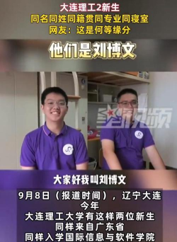 9月8日,辽宁大连。今年,大连理工大学有这样两位新生,同样来自广东省,同样入学国际信息与软件学院,同样都叫刘博文,报到后入住了同一间寝室。具体内容小编已经整理好了,一起来看看吧。