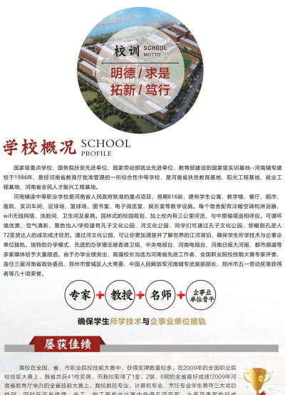 关于2024年河南辅读中等职业学校有哪些专业招生的内容就介绍完了,还想要了解更多学校招生信息,可以直接电话联系学校招生办,向学校招生老师直接咨询,也可以到学校官网查阅相关资料自行了解。