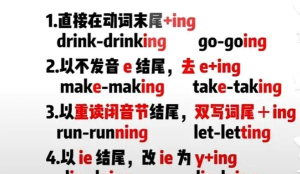 2、动词+ing形式的变化规则。在词尾+ing,以不发音的e的动词去掉e再加ing,以重读闭音节,辅元辅结构的动词,双写末尾的辅音字母,再加ing,以ie的动词,把ie改为y加ing。