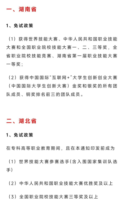 世界技能大赛获奖考生免试。在世界技能大赛中获奖的专科应届毕业生中国国家代表队选手可免试升入对口本科高等学校学习。