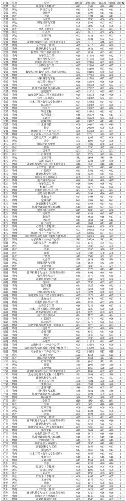 清华大学665分、北京大学656分、上海交通大学651分、复旦大学645分、北京大学医学部644分、中国人民大学644分、南京大学640分、浙江大学640分、武汉大学634分、南开大学626分、北京航空航天大学625分、北京外国语大学624分等等。