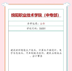 绵阳市建筑工程技术学校是一所以建筑工程技术为特色的职业技术学校,现有建筑工程技术、道路桥梁技术、房地产经营与管理、室内设计四个专业。其中,建筑工程技术专业从事建筑施工、管理、研发等工作,道路桥梁技术专业从事交通建设和道路桥梁施工等方面的工作,房地产经营与管理专业从事房地产销售、经营与管理等工作,室内设计专业从事室内设计、软装搭配等工作。