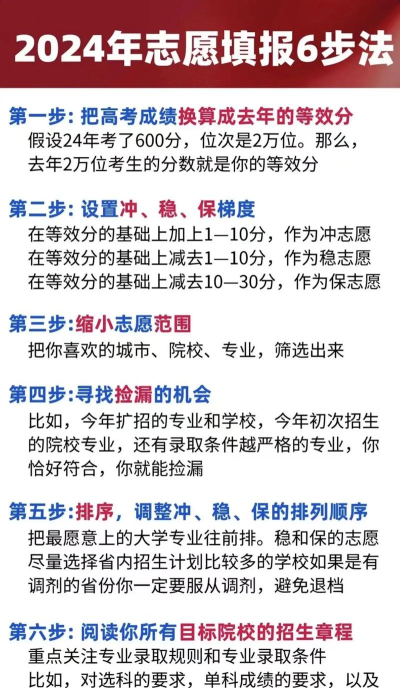冲—冲:把有希望够得着的理想学校作为A志愿;稳—稳:把与自己成绩“门当户对”的学校作为B志愿;保—保:把比自己成绩稍低点的学校作为C志愿。