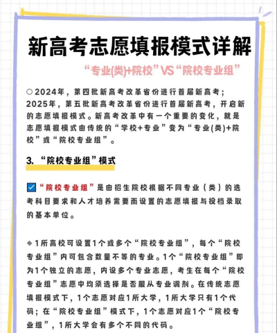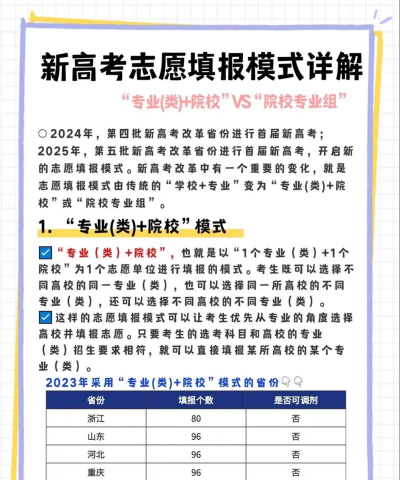 2024实行新高考的有21个省,浙江、山东采用“专业(类)+院校”填报模式;京沪津琼四地采用“院校专业组”方式;重庆、河北、辽宁三地采用“专业+大学”报考形式,即是一个专业+一个大学为一个志愿,大学可重复报考;江苏、广东、福建、湖南、湖北五省采用“院校+专业组”形式报考。