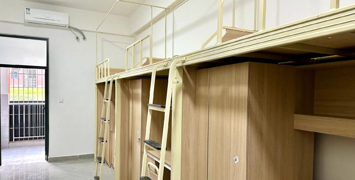 中专学校宿舍楼内每个房间都配置有空调、独立卫生间和基本家具,如床、书桌、椅子、衣柜等,学生可以自由休息和学习。