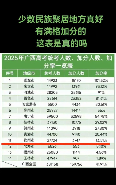 对融水、三江、龙胜、恭城、隆林、富川、罗城、环江、巴马、都安、大化、金秀、资源、凌云、西林、防城港市防城区、东兴市、靖西、那坡、凭祥、大新、宁明、龙州、德保、扶绥、崇左市江州区、天等、上思等28个民族自治县(含享受民族自治县同等待遇县)和边境县(含享受边境县同等待遇县)的少数民族考生,总分加15分。