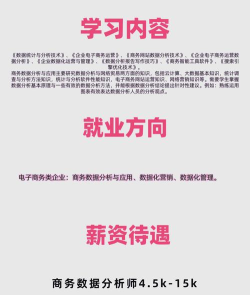 专业核心课程:数据采集与处理、产品数据分析、销售数据分析、供应链数据分析、客户数据分析、市场数据分析、运营管理数据分析、数据可视化。