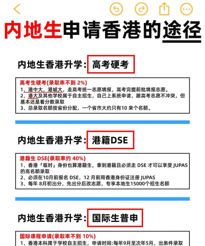 申请方式主要有三种:高考提前批、自主招生、副学士/高级文凭,均可用高考成绩申请!港校申请一般采用滚动式录取,先到先得,所以想内地高考和香港本科申请两手准备的同学和家长,越早开始规划申请,被录取的概率越大。