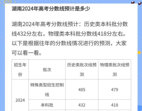 湖南高考物理类特殊类型招生控制线2024分数线预估:478;