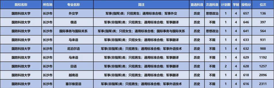国防科技大学2024年在四川招收生长军官本科青年学员共计129人。其中技术类64人(男生理科50人,男生文科10人,女生理科1人,女生文科3人),指挥类7人(男生理科6人,男生文科1人),指技融合类58人(男生理科55人,女生理科3人)。下文是小编整理的2024国防科技大学在四川招生计划及专业详细信息,供大家参考!