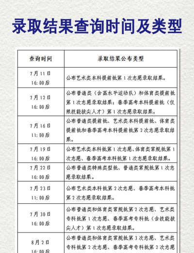 2024年高考录取结果查询时间要分省份分批次来看,大部分录取结果基本都是7月初开始陆续公布,到8月中下旬结束,提前批的志愿录取结果预计在7月初到7月中旬公布,本科批的录取结果预计在7月底到8月初公布,专科批的录取结果预计在8月公布。