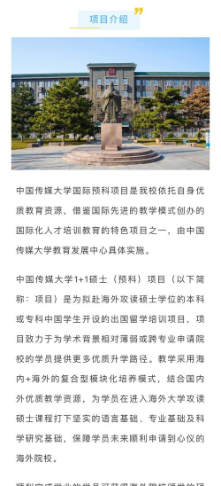 中国传媒大学国际预科项目是一个为有志于就读海外名校的高中学生提供的国际本科预科课程。该项目始于2007年,旨在为学生搭建通往世界名校的桥梁。通过在中国传媒大学一年的全日制学习,学生可以获得海外名校的直接入学资格,无需再读预科。该项目与多所海外名校建立了稳定的合作关系,如英国利兹大学、南安普敦大学、诺丁汉大学、约克大学、伦敦艺术大学,澳大利亚悉尼大学、昆士兰大学等,确保了学生能够进入QS世界高校排名前150位或专业排名本国前5位的海外名校学习。