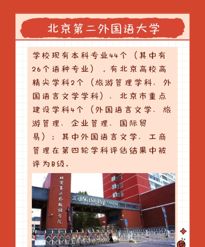 北京第二外国语学院(Beijing International Studies University)是由文化和旅游部与北京市人民政府共建的高水平特色大学,是一所以外语为主体、旅游为特色,多学科协同发展的著名高校,是中国外语、翻译、旅游、经贸等人才培养与研究的重要基地。
