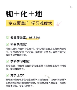 物理+化学+地理:虽然专业覆盖率相对较低,为50.66%,但这个组合在偏理科科目中相对简单,适合对地理和物理感兴趣的学生。这个组合的学习难度不高,竞争压力相对较小。