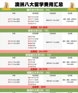 澳洲国立大学留学费用约30-40w。墨尔本大学留学费用约33-40w。悉尼大学留学费用约34-43w。新南威尔士大学留学费用约30-38w。昆士兰大学留学费用约32-38w。莫纳什大学留学费用约28-36w。阿德莱德大学留学费用约31-33w。西澳大学留学费用约28-39w。