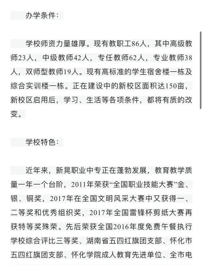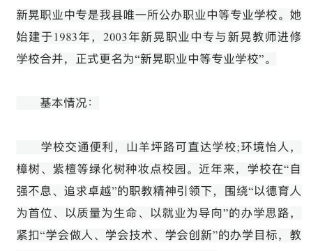 新晃职业中等专业学校专业名单:电子商务、电子技术应用、服装设计与工艺、学前教育、汽车运用与维修、计算机应用、旅游服务与管理。