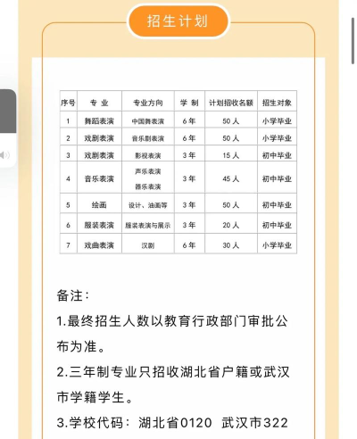 武汉艺术学校专业名单:舞蹈表演、戏剧表演、音乐剧、音乐、美术绘画、服装展示与礼仪、曲艺
