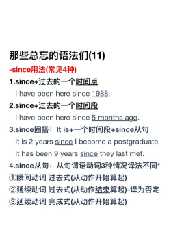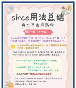 since的用法:与since +时间(起点)连用,表示自…以来。与since +一段时间+ ago连用,表示自…以前就…。与since +从句(从句用一般过去时)连用,表示自某事发生后就一直…。