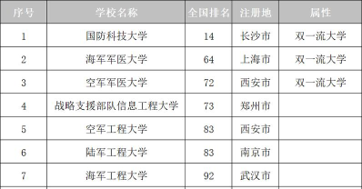 1、北京军事大学7所:中国人民解放军国防大学、中国人民解放军陆军装甲兵学院、中国人民解放军陆军航空兵学院、中国人民解放军陆军防化学院、中国人民解放军空军指挥学院、中国人民解放军战略支援部队航天工程大学、中国人民武警警察部队特种警察学院。