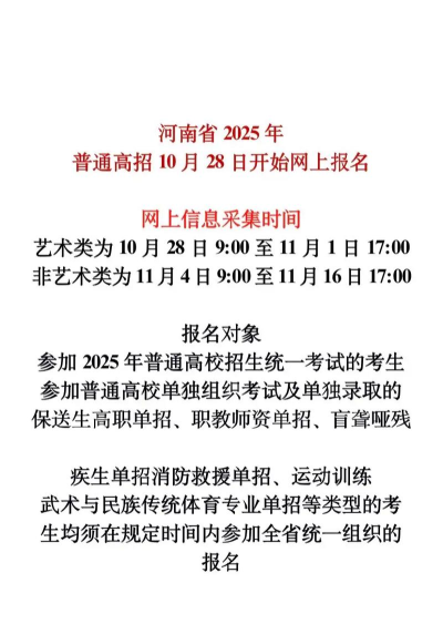 参加普通高校单独组织考试及单独录取的保送生、高职单招、职教师资单招、盲聋哑残疾生单招、消防救援单招等考生均须在规定时间内参加全省统一组织的报名。河南省2025年普通高招报名网上信息采集时间:非艺术类为2024年11月4日9:00至11月16日17:00。