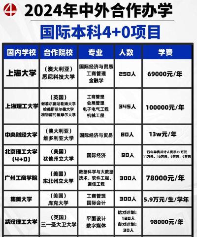 教育质量:4+0国际本科项目通常由教育部批准,与国外知名大学合作,采用国外优质教学体系。学生可以享受国内211、985高校的教育资源,师资力量强。