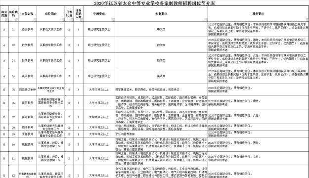 江苏省太仓中等专业学校专业有:模具设计与制造、机械设计与制造、国际商务、港口机械与智能控制、现代物流管理、电子商务共10个五年制一贯制专业和分析检验技术、会计事务、物流服务与管理、数控技术、艺术设计、机电设备技术、汽车检测与维修技术、计算机应用、网络信息安全、高星级饭店运营与管理、物联网技术应用、商务德语8个3+3中高职分段培养专业。学校建有江苏省示范专业3个,江苏省品牌专业3个,江苏省特色专业1个。数控、艺术设计、计算机专业群为省级现代化专业群。