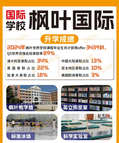 升学率和国际认可度:枫叶国际学校的毕业生在国际升学中表现出色。2024届毕业生共收到海内外14个国家及地区171所大学的录取通知书3224份,87%的毕业生被QS世界百强名校录取,QS三十强录取率达41%。