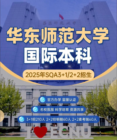华东师范大学SQA3+1项目为广大高中毕业生提供了在国内接受国外优质教育资源的机会,为学生和家长节省了昂贵的留学费用的同时,还可享受到国内大学优质的学习资源,并结识一批志同道合的朋友,促使学生的全面发展,为今后的留学及就业增加助力。