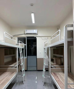 八人一间,上下铺。配备风扇。周边绿树成荫,冬暖夏凉。有网线,可以上网。