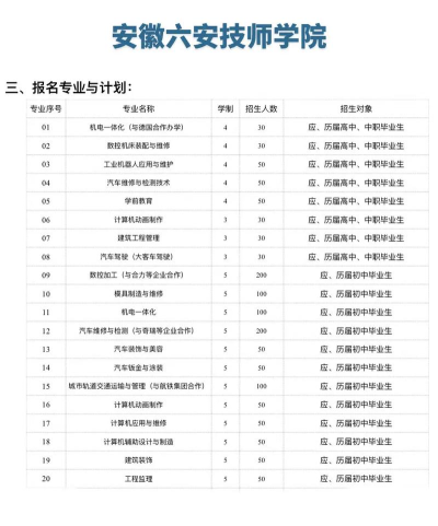 安徽六安技师学院专业设置:数控机床加工、模具制造与维修、汽车维修与检测、计算机网络技术、学前教育、烹饪、电子商务、城市轨道交通运输与管理。