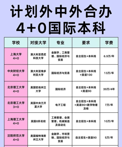 国际本科4+0项目是一种中外合作办学的模式,学生可以在国内完成全部学业,并获得国外大学的学士学位。以下是一些经教育部批准的中外合作办学4+0项目的院校: