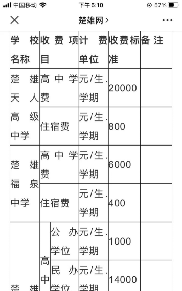 楚雄民中族等专业学校学费;中职阶段所有学费由国家免费