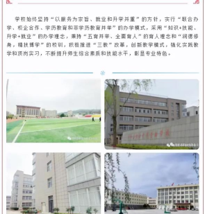 学校占地100亩,建筑面积36469平方米,有图书10万余册。开设新能源汽车维修、智能养老、无人机操作、市政工程施工、计算机应用、文秘、电子商务、机电技术、汽车运用与维修、护理、园林技术、家政服务等专业。