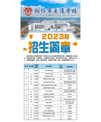 贵州省铜仁市交通学校是一所省级研训示范校、省级中职强基工程学校。学校秉承德育为先,以技立身的办学宗旨;坚持升学为主,就业为辅的办学理念,将学生未来长期发展所需的人生技能培养和当前实现升学、就业所需的职业技能训练相结合,培养高校、企业欢迎的技术人才。引导、帮助学生成为幸福的人生赢家。