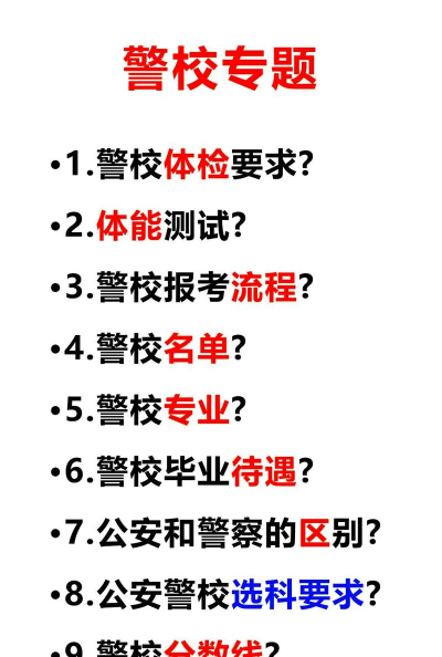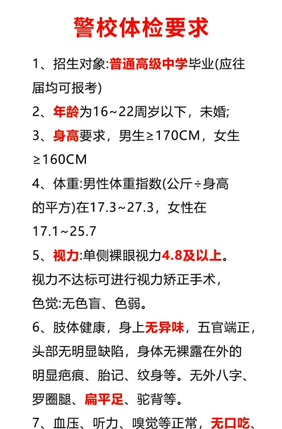 报考警校不仅需要高考成绩达到录取线,还需满足身体条件(如身高、体重、视力等)、心理健康、无违法犯罪记录等多方面要求。政审环节尤其严格,涉及考生本人及其直系亲属的政治历史。