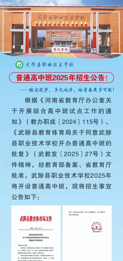 武陟县职业技术学校,是当地唯一的一所公办国家级重点中等职业学校,是河南省文明学校、河南省职业教育特色学校、河南省职业教育攻坚先进单位、河南省职业教育教学先进单位、焦作市文明单位。学校现有教职工150人,其中高级讲师38人,讲师68人,专任教师148人,双师型 教师79人,在校学生1170人。