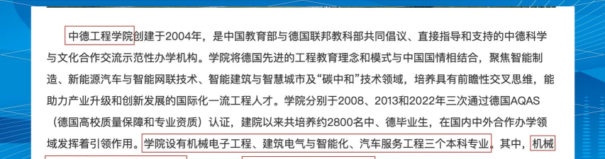 学校建有一个中德工程学院,属于中外合作办学机构。不过它同别的中外合作办学项目不同,并不是和某个德国的大学合办的,而是中国教育部与德国联邦教研部共同倡议、直接指导和支持的中德科学与文化合作交流示范性办学机构,在格局和档次上天然高了其它中外合作办学项目一头。它同德国高校国际合作联合会的26所德国应用科学大学都展开了合作,借鉴德国先进的工程教育理念和模式,面向中国制造2025和德国工业4.0,培养符合先进制造技术、新能源汽车与智能网联技术、智慧城市以及建筑智能化发展趋势和产业升级要求的创新人才和精英工程师。