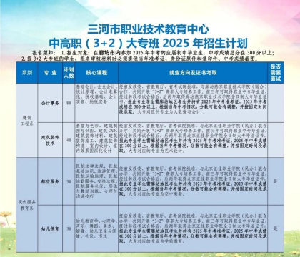 三河市职业技术教育中心始建于1991年,是国家中等职业教育重点学校、第三批国家中等职业教育改革发展示范学校、河北省中等职业教育名牌学校。2016年2月,由三河市职业技术教育中心申请举办的三河市技工学校批准成立,两所学校实行一套人马,两块牌子的办学格局。成为集中职教育、技工教育、远程教育、技能培训于一体,办学性质多层次、多形式、多功能的综合性国办全日制中等职业学校。