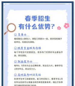春招是职业学校在春季对初三学生进行的招生活动,在每年的2、3月份举行。春招的学校主要以中专为主,但是职高学校也会有部分院校参加春招,只是招生的学校数量比较少。一般学校都会对学生的面试和综合成绩做出要求,只是职高学校在这一方面要求会更高,由于会有很多的人想要去职高读书,所以春招的时候竞争也是很激烈的,想通过春招进职高的同学得在平时成绩和面试上多下功夫。