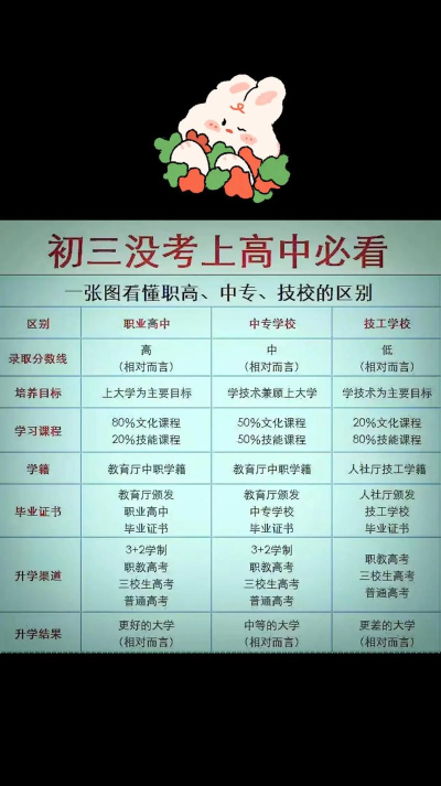 高中为学生提供广泛的文化课教育,为升入大学打下坚实的基础。高中毕业后,学生可以选择继续深造,进入大学学习,或者选择就业。职校则专注于职业技能的培养,为学生直接进入职场做准备。职校毕业后,学生通常会获得一定的职业技能证书,可以直接进入相关行业工作。