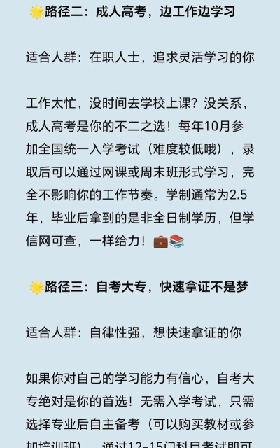 中专生想要提升学历读大专,除了这些途径外,还有近年来兴起的网络教育和国家开放大学等,每一种升学途径都能帮助中专生们找到更好的自己。从中专到大专,不仅仅是一字之差,更是命运阶梯的上升,相信努力之下,每个人都有发光的未来。