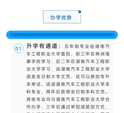 学校与湖南汽车工程职业学院签订3+2五年制高职合作办学。五年制高职学生的家庭投入教育成本低,教育效益和回报高。前三年在株洲海事职业学校培养,后两年在湖南汽车工程职业学院培养,毕业后可获取全日制高职文凭。