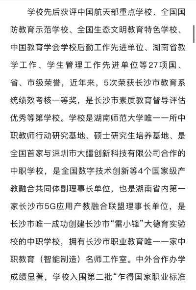 综上,长沙航天学校虽然是中职学校,但是其实力也是非常雄厚的。该校实现了对学生的优质培养,办学特色突出。每年的中考后,该校的报名竞争激烈度是比较大的,如果大家对于这所学校比较看好,就需要把握报名时机,这样才不至于让自己错过找校通。