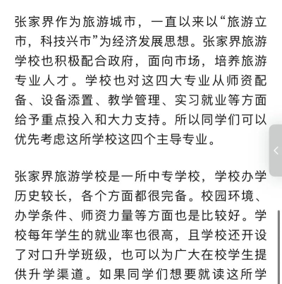 该校开设专业有导游、旅游服务与管理、航空服务、海乘服务、计算机应用、幼儿师范、阳戏等14个专业,可以看出该校专业偏向于文科性质,并以旅游相关专业作为其王牌专业,背靠张家界的旅游大市场,该校学旅游的学生具备广阔的就业市场,并能依托当地的旅游业,得到良好的个人发展。
