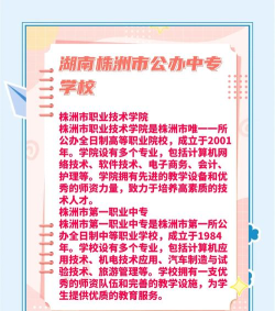 1、株洲市工商职业技术学校。株洲市工商职业技术学校(株洲技术学院)。湖南省商业职业中等专业学校(湖南省商业技师学院)。株洲市工业中等专业学校。株洲市幼儿师范学校。株洲市交通技工学校。